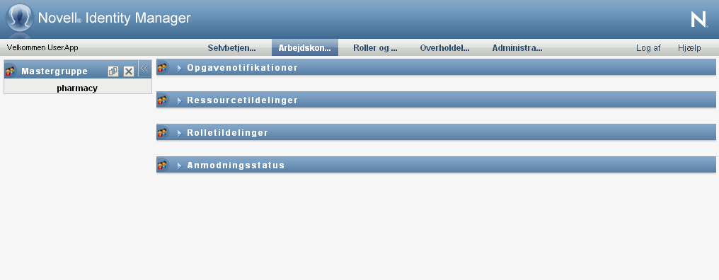 Når du vælger en gruppe, viser afsnittet Brugerprofil og afsnittene Opgavenotifikationer, Ressourcetildelinger, Rolletildelinger og Anmodningsstatus dette ikon:
