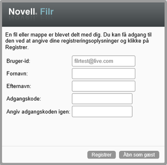 Når du deler et element med en bruger, der ikke er en del af din organisation, oprettes der automatisk en Filr-konto for denne bruger med brugerens e-mailadresse. Brugeren skal derefter registrere sig på Filr-webstedet.