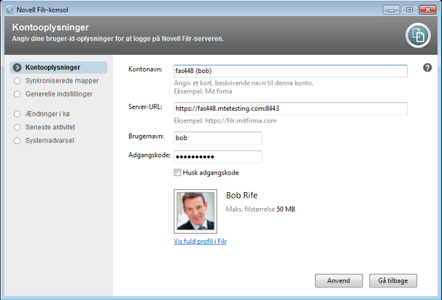 Server-URL: Angiv URL-adressen til det Filr-websted, hvor du vil synkronisere filer med din computer, f.eks. https://Filr.mitfirma.com.