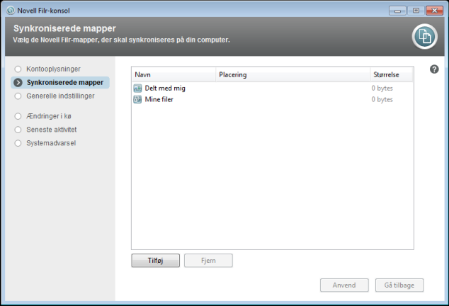 Når du konfigurerer Filr-desktopprogrammet første gang, kan du vælge, hvilke mapper du vil synkronisere. Mine filer og Delt med mig synkroniseres som standard. Netmapper skal konfigureres manuelt for at blive synkroniseret. Du kan konfigurere mapper til at blive synkroniseret under den indledende konfiguration eller når som helst efter den indledende konfiguration.