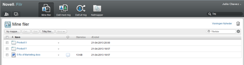 Første gang du starter Novell Filr i en webbrowser, får du vist siden Mine filer. Du kan administrere alle de filer, du har oprettet, på denne side.