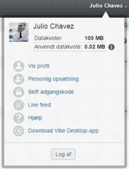 Linket navn: Klik på dit linkede navn øverst til højre på en hvilken som helst Vibe-side for at få vist følgende indstillinger: