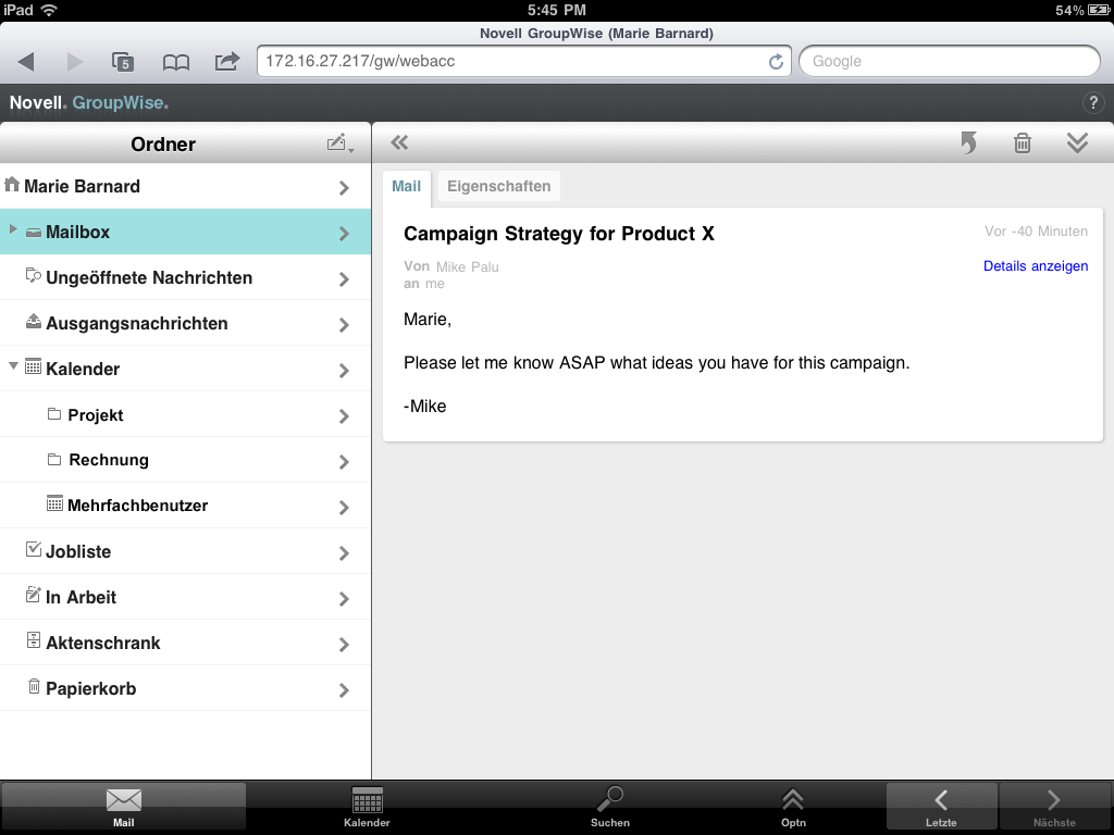 Wenn Sie sich über den Webbrowser bei GroupWise anmelden, wird Ihre Mailbox angezeigt.