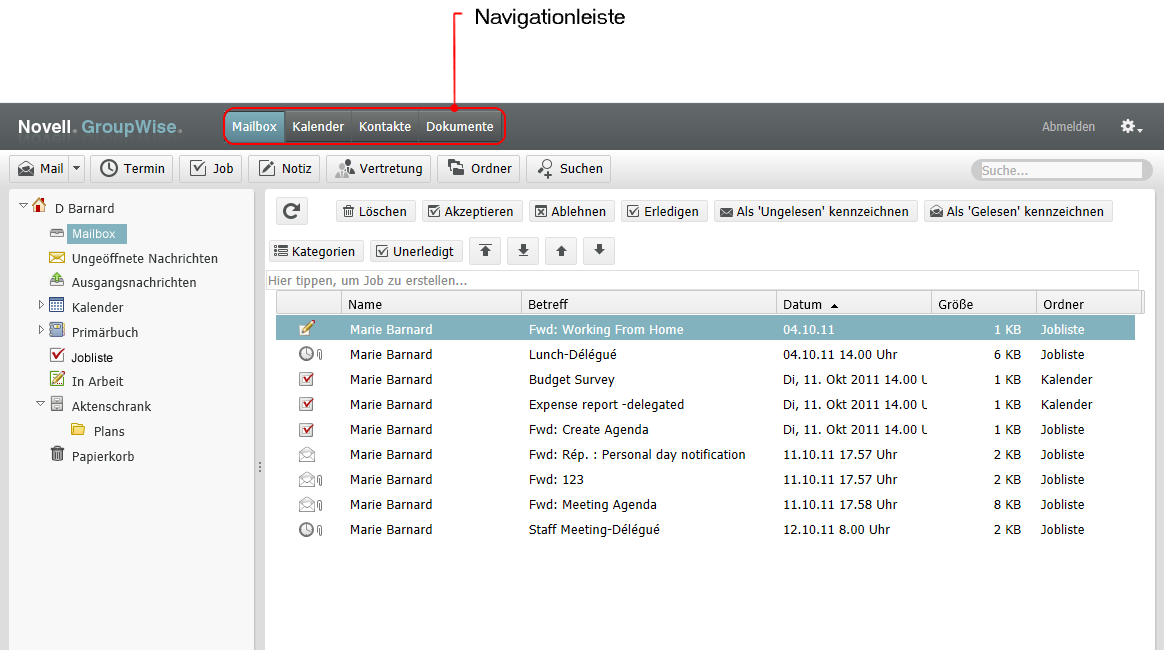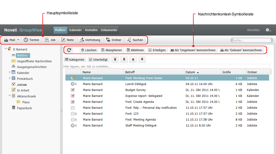 Der Hauptarbeitsbereich von GroupWise wird als Hauptfenster bezeichnet. Im Hauptfenster von GroupWise können Sie Ihre Nachrichten lesen, Termine planen, Ihren Kalender anzeigen, Kontakte verwalten, Ordner öffnen usw.