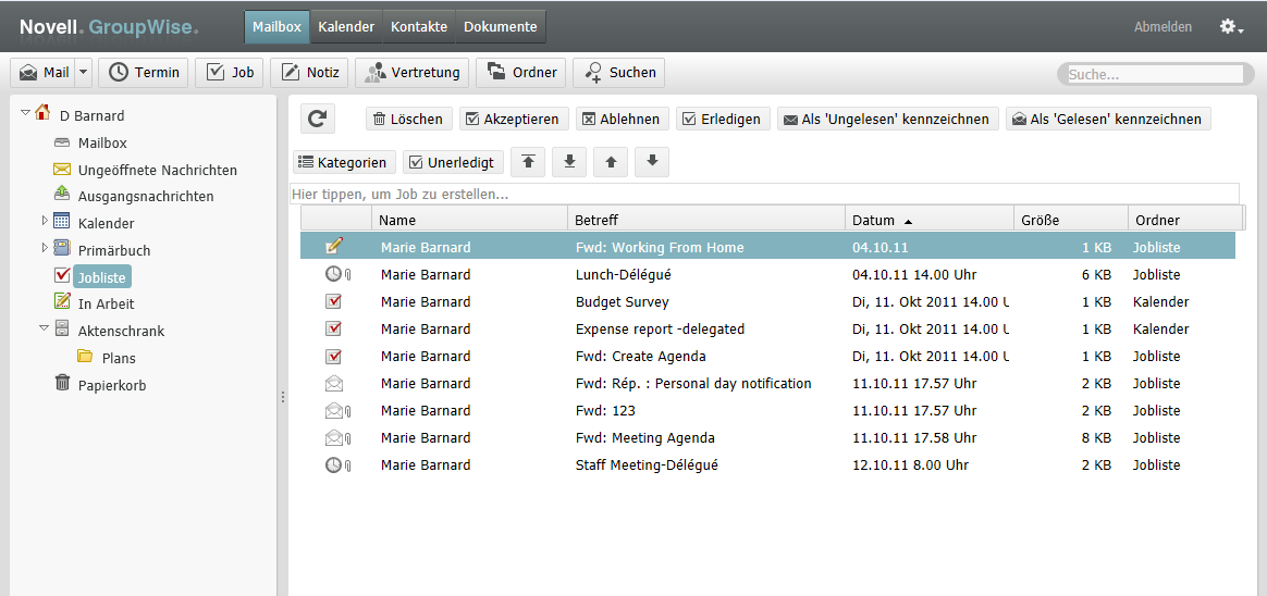 HINWEIS:Der Joblistenordner ersetzt den Checklistenordner der früheren GroupWise-Versionen. Checklisteneinträge werden im Joblistenordner angezeigt, aber nicht in Jobs konvertiert.