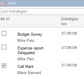 Nachdem Sie einen Job erledigt haben, können Sie ihn als erledigt kennzeichnen. Als erledigt gekennzeichnete Jobs werden im Kalender nicht zum nächsten Tag übertragen. Erledigte Jobs werden im Kalender durch ein Häkchen gekennzeichnet. Überfällige Jobs werden in der Jobliste im Bereich angezeigt.