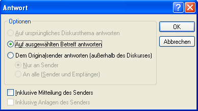 Bei der Beantwortung einer Email können Sie wählen, ob die Nachricht des Senders und in der Nachricht enthaltene Anlagen einbezogen werden sollen.