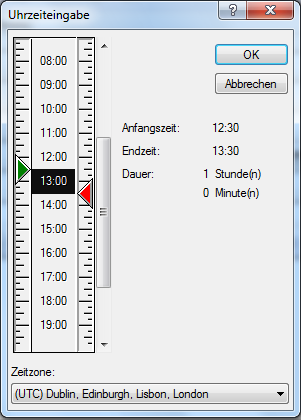 Mit dem grünen Pfeil können Sie eine Startzeit und mit dem roten Pfeil eine Endzeit auswählen. Die aktuell ausgewählten Uhrzeiten werden auf der rechten Bildschirmseite angezeigt. Sie können kleine Intervalle von 15 Minuten verwenden.
