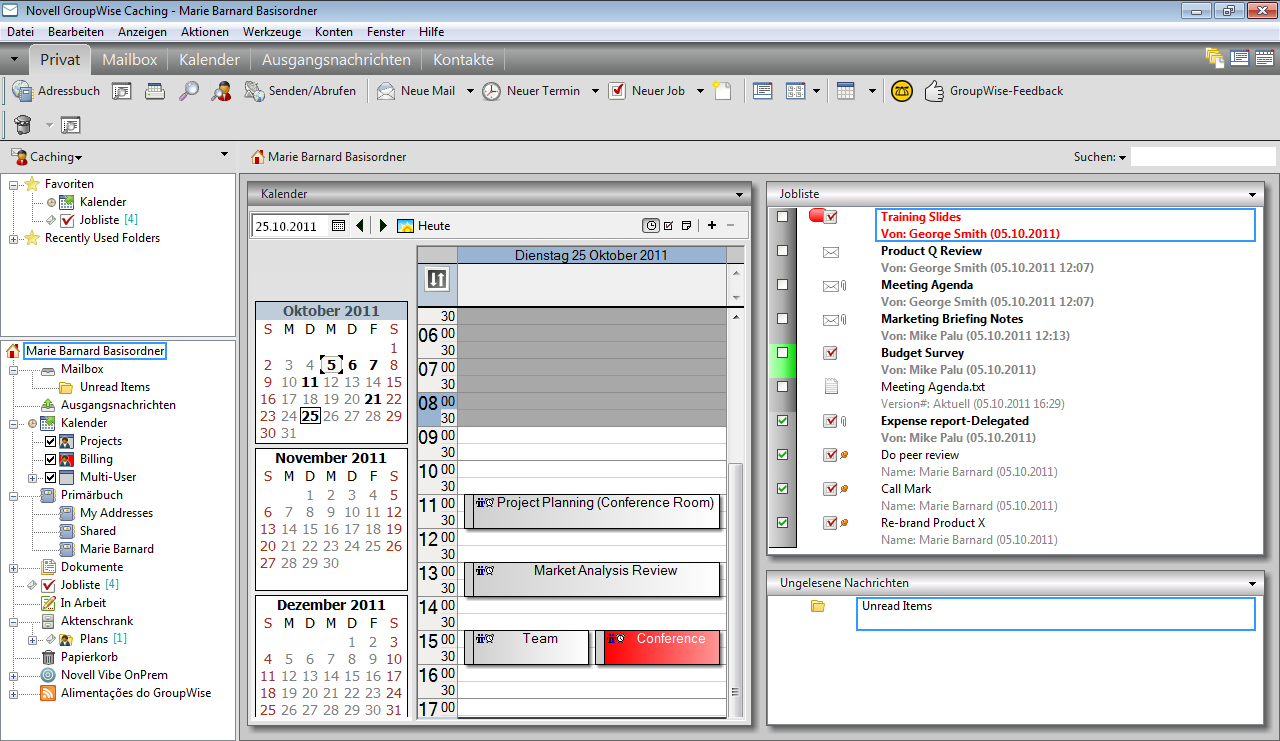 Im Caching-Modus wird eine Kopie Ihrer Netzwerk-Mailbox, einschließlich der Nachrichten und sonstiger Informationen, auf dem lokalen Laufwerk gespeichert. Auf diese Weise können Sie GroupWise auch dann verwenden, wenn das Netzwerk oder der Post-Office-Agent nicht verfügbar ist. Da nicht die ganze Zeit eine Verbindung mit dem Netzwerk besteht, bietet dieser Modus die beste Leistung und es fällt wenig Netzwerkverkehr an. Zum Abrufen und Senden neuer Nachrichten wird automatisch eine Verbindung hergestellt. Sämtliche Aktualisierungen finden im Hintergrund statt, sodass Sie Ihre Arbeit nicht unterbrechen müssen.