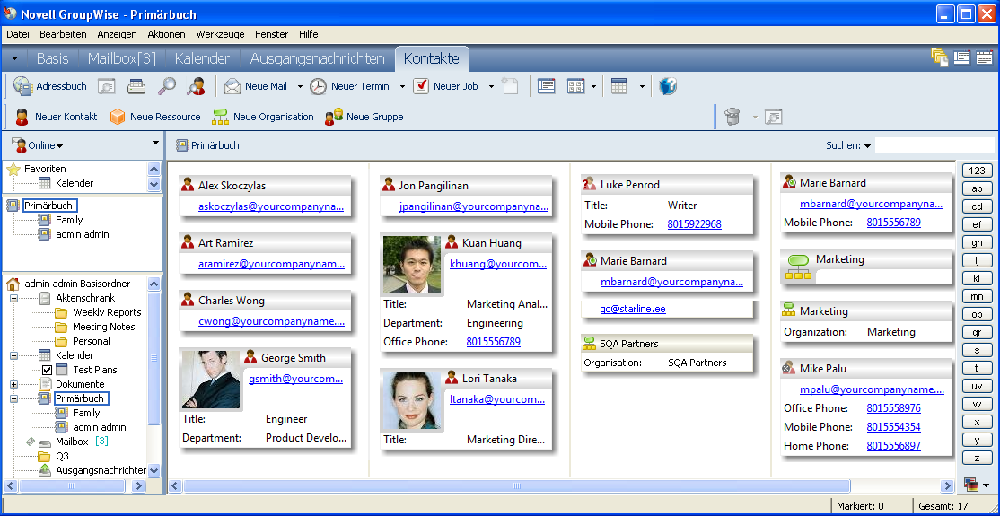 in der GroupWise-Ordnerliste stellt standardmäßig das GroupWise-Adressbuch dar. Weitere Kontakteordner stellen Ihre persönlichen Adressbücher dar.