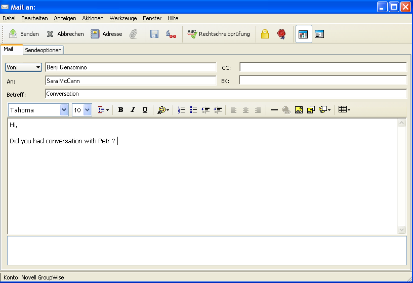 Von GroupWise aus können Sie eine Email-Nachricht als Text oder HTML senden. Zudem können Sie eine Datei anhängen, eine Signatur oder vCard hinzufügen und die Rechtschreibung in der Nachricht vor dem Versand prüfen.