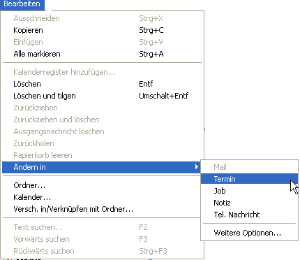 Sie können eine Nachricht in Ihrer Mailbox in eine andere Nachrichtenkategorie ändern. So können Sie beispielsweise eine Mail-Nachricht in Ihrer Mailbox in einen Termin in Ihrem Kalender ändern. Der neue Termin enthält all die Daten aus der Mail-Nachricht (z. B. -, - und -Listen, den Betreff sowie den Mitteilungstext), die auch für den Termin verwendet werden können.
