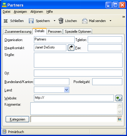 Details: Verwenden Sie diese Seite, um die folgenden Informationen zu diesem Kontakt anzugeben: Beruf, Abteilung, Standort, Abteilungsleiter, Assistent, Geburtstag, Jahrestage, Ehegatte, Kinder, Hobbys sowie alle mit diesem Kontakt verknüpften Internetadressen.