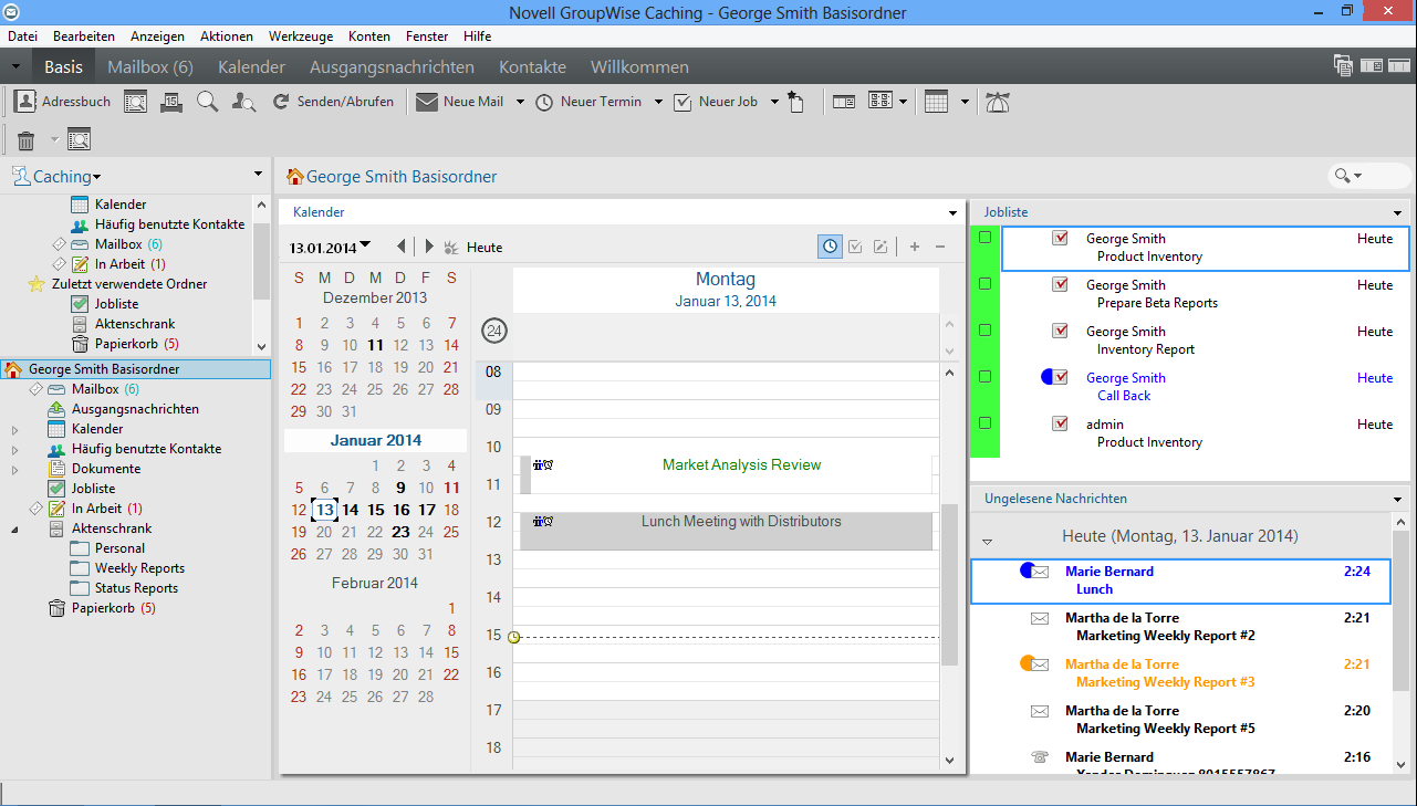 Im Caching-Modus wird eine Kopie Ihrer Netzwerk-Mailbox, einschließlich der Nachrichten und sonstiger Informationen, auf dem lokalen Laufwerk gespeichert. Auf diese Weise können Sie GroupWise auch dann verwenden, wenn das Netzwerk oder der Post-Office-Agent nicht verfügbar ist. Da nicht die ganze Zeit eine Verbindung mit dem Netzwerk besteht, bietet dieser Modus die beste Leistung und es fällt wenig Netzwerkverkehr an. Zum Abrufen und Senden neuer Nachrichten wird automatisch eine Verbindung hergestellt. Alle Aktualisierungen werden im Hintergrund ausgeführt, sodass Sie Ihre Arbeit nicht unterbrechen müssen.
