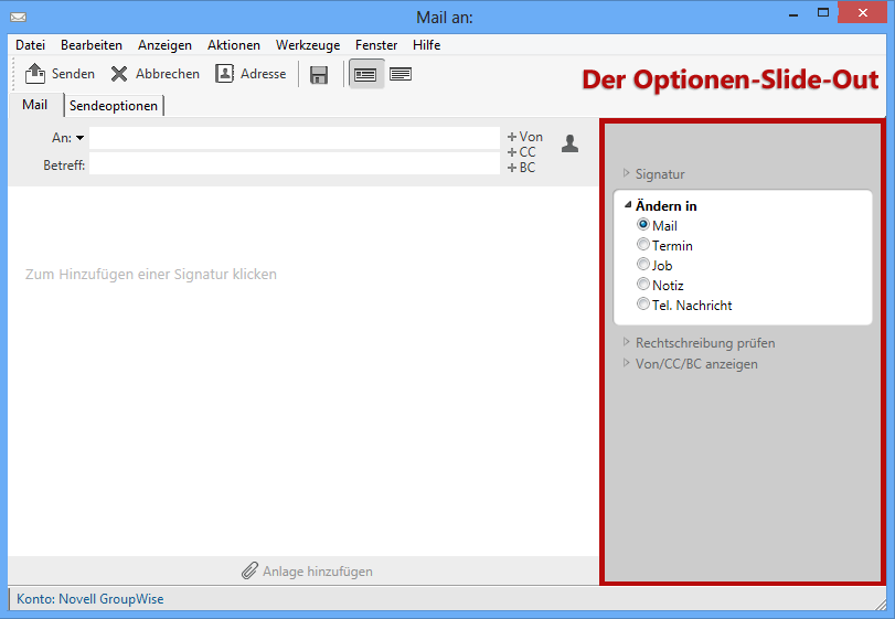 Mit dem neuen Options-Slide-Out im Erstellen- und Empfangen-Layout können Sie die zu erstellenden oder zu bearbeitenden Nachrichten noch leichter anpassen und viele wichtige Einstellungen lassen sich direkt ändern.