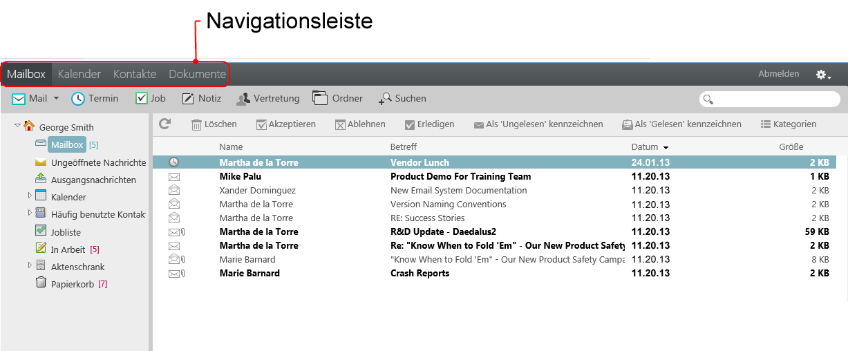 Die Navigationsleiste befindet sich ganz oben auf der WebAccess-Seite. Sie dient dem schnellen Zugriff auf die Ordner, die Sie am häufigsten verwenden. Laut Standardeinstellung enthält die Navigationsleiste die Ordner Mailbox, Kalender, Kontakte und Dokumente.