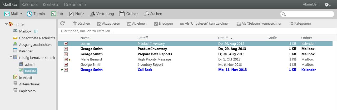 Wenn Sie einen Job aufgeben oder akzeptieren, wird er automatisch im Joblistenordner angezeigt. Zudem kann jede Nachrichtenkategorie (Mail, Termin, Job, Notiz, telefonische Nachricht) im Joblistenordner abgelegt werden. Sie können beispielsweise eine Email-Nachricht im Ordner "Jobliste" platzieren, um sich selbst daran zu erinnern, dass Sie sie bearbeiten müssen.