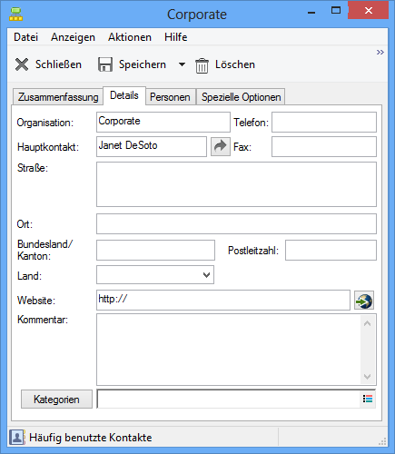 Wenn Sie im Feld Firma einen Namen eintragen, für den Sie eine Organisation erstellt haben, so werden die Organisationsinformationen automatisch in die entsprechenden Felder des neuen Kontakts übernommen.