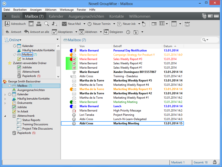Alle ungeöffneten Nachrichten in Ihrer Mailbox werden fett dargestellt. So können Sie problemlos feststellen, welche Nachrichten und Dokumente Sie noch nicht gelesen haben. Dies ist besonders hilfreich für ausgeblendete Diskursabfolgen, weil Sie so stets wissen, welche Diskursabfolgen neue Nachrichten enthalten.