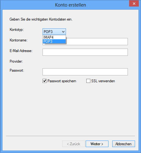 Wenn der Anbieter erkannt wird, werden die ein- und ausgehenden Mailserverinformationen bereitgestellt. Ist der Email-Anbieter unbekannt, werden die Felder Eingangs-Mail-Server und Ausgangs-Mail-Server angezeigt und müssen ausgefüllt werden.