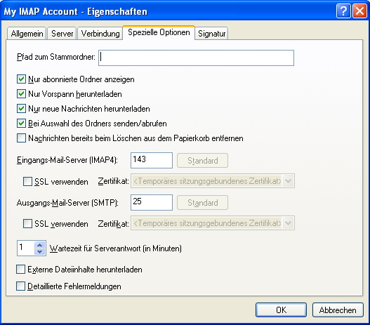 Diese Funktion ist verfügbar, wenn Ihr IMAP4-Server das Abonnieren oder Kündigen von Abonnements für Ordner unterstützt. Wenn Sie das Abonnement für einen Ordnern kündigen, wird er nicht mehr in der Ordnerliste unter dem IMAP4-Server angezeigt, obwohl er sich noch immer in Ihrem IMAP4-Konto befindet. Dies ist besonders hilfreich, wenn Sie über einen IMAP4-Ordner auf ein NNTP-Konto zugreifen.