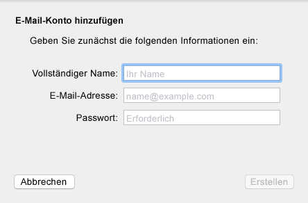 Stellen Sie vor dem Konfigurieren der Mac Mail App sicher, dass Sie die für IMAP und SMTP erforderlichen Informationen von Ihrem GroupWise Administrator erhalten haben. Diese stellen eingehende und ausgehende Email-Verbindungen für die Mac Mail App bereit.