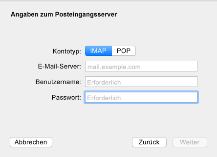 Geben Sie den IMAP-Server an. Ihr Benutzername und das Passwort sollten bereits ausgefüllt sein.