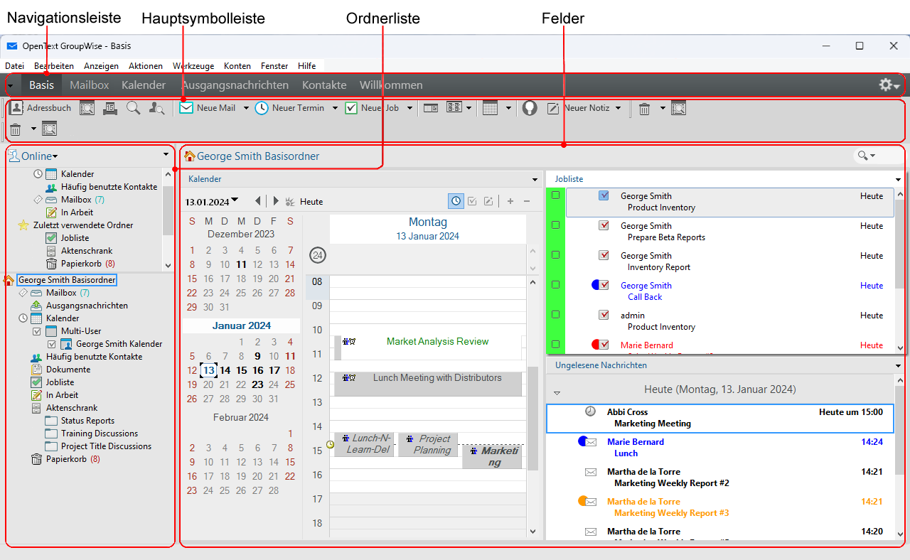 Der Hauptarbeitsbereich von GroupWise wird als Hauptfenster bezeichnet. Im Hauptfenster können Sie Ihre Nachrichten lesen, Termine planen, Ihren Kalender anzeigen, Kontakte verwalten, den Ausführungsmodus von GroupWise ändern, Ordner und Dokumente öffnen und vieles mehr.