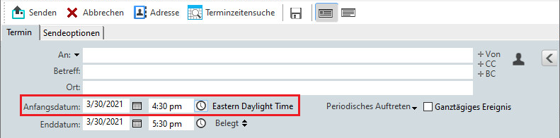Wenn Sie beim Erstellen eines Termins eine Zeitzone auswählen, wird der Termin so angepasst, dass er zu der von Ihnen in der ausgewählten Zeitzone festgelegten Zeit geplant wird. Wenn Sie beispielsweise einen Termin für 16:30 Uhr Eastern Daylight-Zeit in den Vereinigten Staaten vereinbaren und sich in der Pacific Daylight-Zeitzone befinden, wird dieser um 13:30 Uhr PDT in Ihrem Kalender angezeigt.