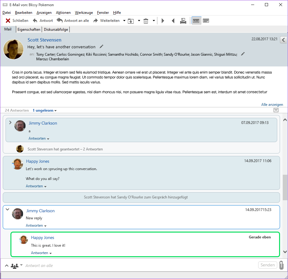 Neue Antworten in der Unterhaltung haben eine grüne Abgrenzung. Sie bleiben für 3 Minuten grün, nachdem Sie die Nachricht gelesen haben. Sie können ungelesene Objekte aus einem Objekt in der Objektliste löschen, indem Sie mit der rechten Maustaste auf die grüne Nummer neben dem Objekt klicken, die für ungelesen steht.