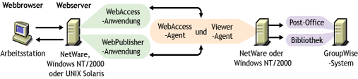 Die WebAccess-Anwendung und die WebPublisher-Anwendung können auf einem NetWare-, Linux-, Windows- oder UNIX-Webserver installiert werden. Sofern gewünscht, können Sie den WebAccess-Agenten und den Dokumentenbetrachter-Agenten mit dem Webserver auf demselben Server installieren.