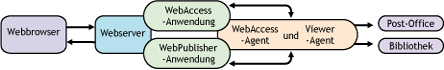 WebAccess-Agent: Der WebAccess-Agent empfängt Benutzeranfragen von der WebAccess- und der WebPublisher-Anwendung. Er greift auf Post-Offices und Bibliotheken zu, um die Anfragen zu verarbeiten, und gibt anschließend die entsprechenden Informationen an die Anwendungen zurück.