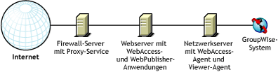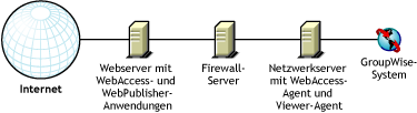 Wenn in Ihrer Firewall kein Proxy-Dienst zur Verfügung steht, müssen Sie die WebAccess-Anwendung und die WebPublisher-Anwendung auf einem Webserver außerhalb der Firewall installieren. Da für den WebAccess-Agenten ein Direktzugriff (verbundener Pfad oder UNC-Pfad) auf ein GroupWise-Domänenverzeichnis erforderlich ist, muss er auf einem Server innerhalb der Firewall installiert werden.