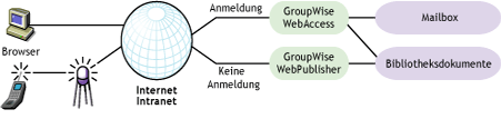 Figure 5-1 Während sich der Benutzer bei Verwendung von GroupWise WebAccess bei einer GroupWise-Mailbox anmelden muss, ist dies bei GroupWise WebPublisher nicht erforderlich.