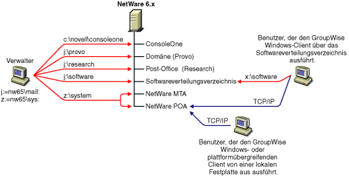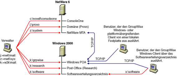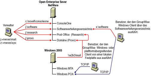 Die unten abgebildete Grafik veranschaulicht die Domäne und den MTA auf einem NetWare 6-Server. Das Post-Office, das Softwareverteilungsverzeichnis sowie der POA befinden sich auf einem Windows 2000-Server. Der MTA kommuniziert per TCP/IP mit dem POA.
