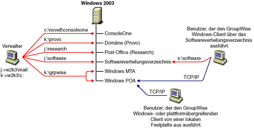 Die folgende Grafik zeigt alle GroupWise-Komponenten auf einem Windows 2003-Server: