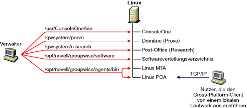 Die folgende Grafik zeigt alle GroupWise-Komponenten auf einem Linux-Server: