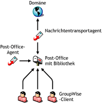 Der GroupWise-Post-Office-Agent (POA) ist für die Zustellung von Nachrichten zwischen den Mailboxen der Benutzer in einem Post-Office zuständig und der GroupWise-Nachrichtentransportagent (Message Transfer Agent (MTA)) ist für den Transport von Nachrichten zwischen Post-Offices (bei Domänen mit mehr als einem Post-Office) und zwischen Domänen (bei Systemen mit mehr als einer Domäne) zuständig.