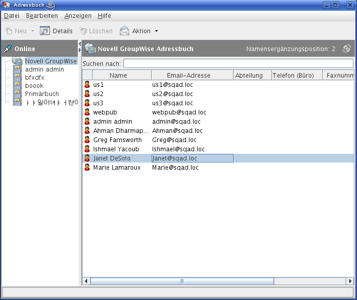 Um ein Adressbuch zu öffnen, klicken Sie auf die Schaltfläche in der Symbolleiste des Hauptfensters. Das Adressbuch wird geöffnet. Im linken Teilfenster werden das GroupWise-Adressbuch, das Primärbuch und die von Ihnen erstellten persönlichen Adressbücher aufgelistet.