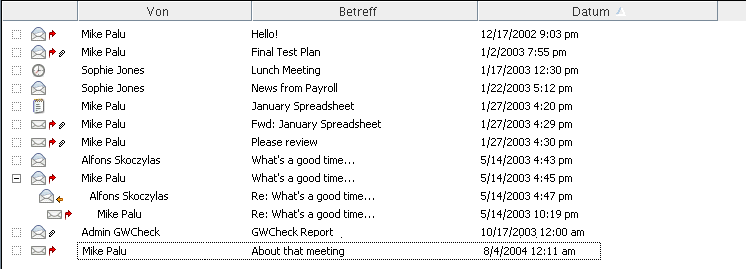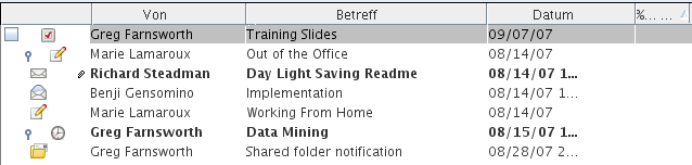Die Nachrichtenliste in einem Ordner ist in Spalten gegliedert. In jeder Spalte werden Informationen über die in der Liste aufgeführten Nachrichten angezeigt. So werden beispielsweise der Betreff und das Sendedatum der Nachrichten in verschiedenen Spalten angezeigt. Sie können die Spaltenanzeige für jeden Ordner anpassen.