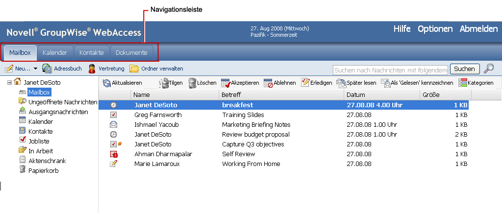 Der Hauptarbeitsbereich von GroupWise wird als Hauptfenster bezeichnet. Im Hauptfenster von GroupWise können Sie Ihre Nachrichten lesen, Termine planen, Ihren Kalender anzeigen, Kontakte verwalten, Ordner öffnen usw.