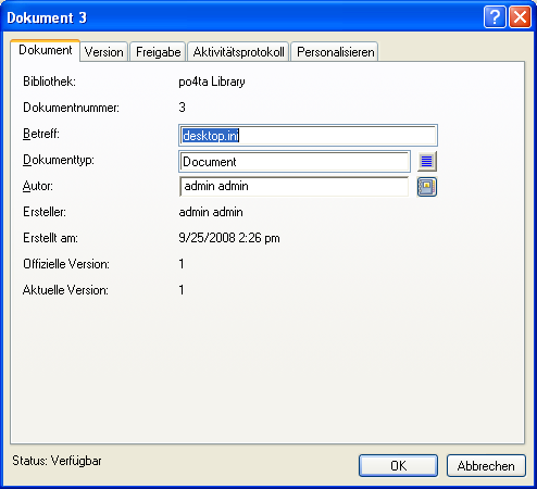 Sie können das Register "Dokument" im Eigenschaftenfenster verwenden, um Versionsinfos über das Dokument und Protokollinformationen anzuzeigen und die Freigabe des Dokuments für andere Benutzer zu steuern.