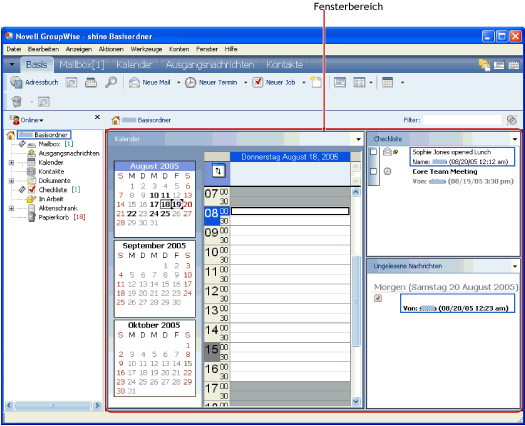 Der Standard-Basisordner zeigt Ihren Kalender für den aktuellen Tag, die Einträge in Ihrer Jobliste und Ihre ungelesenen Nachrichten.
