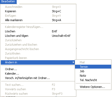 Mit der Option "Ändern in" kann die Nachrichtenkategorie einer Nachricht in der Mailbox geändert werden. So können Sie beispielsweise eine Mail-Nachricht in Ihrer Mailbox in einen Termin in Ihrem Kalender ändern. Der neue Termin enthält all die Daten aus der Mail-Nachricht (z. B. -, - und -Listen, den Betreff sowie den Mitteilungstext), die auch für den Termin verwendet werden können.