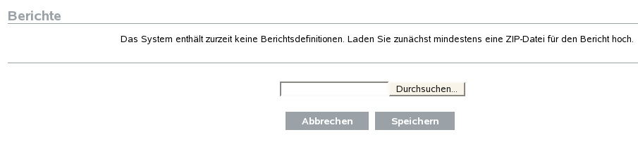 Im Lieferumfang von Identity Audit sind Berichte enthalten, Sie können jedoch neue Bericht-Plugins (bestimmte ZIP-Dateien, die die Berichtdefinition und Metadaten enthalten) in Identity Audit hochladen. Wenn im System keine Berichte vorhanden sind, wird der folgende Bildschirm angezeigt: