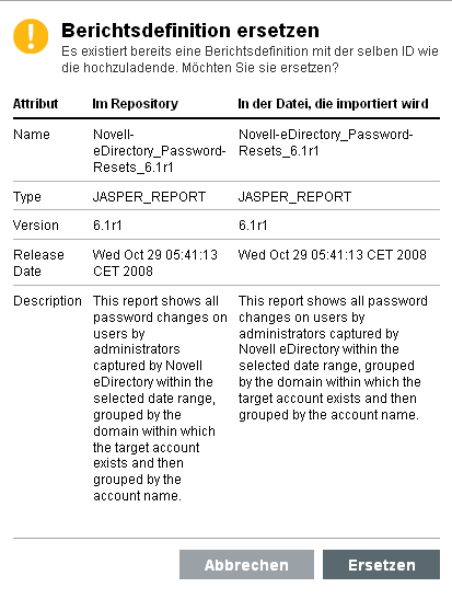 Sie können aktualisierte Berichte in Identity Audit hochladen, um vorhandene Berichte zu ersetzen. Weitere Informationen finden Sie unter Abschnitt 5.4.1, Hinzufügen von Berichten.
