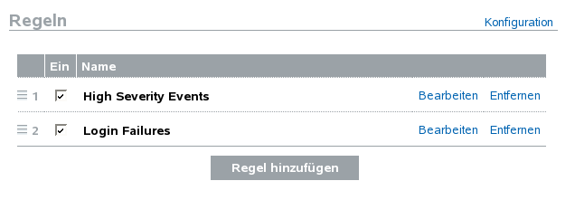 Links neben jeder Regel in der Spalte "Ein" befindet sich ein Kontrollkästchen zum Aktivieren der Regel. Neue Regeln werden standardmäßig aktiviert. Wenn Sie eine Regel deaktivieren, werden eingehende Ereignisse nicht länger entsprechend dieser Regel bewertet. Wenn sich Ereignisse bereits in der Warteschlange für eine oder mehrere Aktionen befinden, dauert es möglicherweise einige Zeit, bis diese Warteschlange nach dem Deaktivieren der Regel geleert ist.