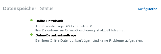Auf dieser Seite wird angezeigt, ob verschiedene Datenbankfunktionen fehlerfrei funktionieren (grün), eine Warnmeldung (gelb) oder eine Fehlermeldung (rot) anzeigen.
