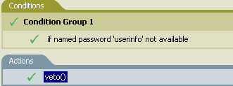 Mit dem Richtlinien-Builder können Sie ein benanntes Passwort aufrufen. Erstellen Sie eine neue Regel und wählen Sie „Benanntes Passwort“ als Bedingung. Sie legen eine Aktion abhängig davon fest, ob das benannte Passwort verfügbar ist oder nicht. Das folgende Beispiel zeigt, dass, wenn die Benutzerinformationen für das benannte Passwort nicht verfügbar sind, gegen das Ereignis ein Veto eingelegt wird.