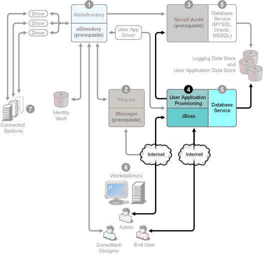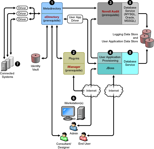 3. The secure logging service. Repository for logging events (Identity Manager software is not installed on this server, but having a secure logging service is mandatory). This is a central service that is used by Identity Manager and the end-user application and workflow system services and is downloaded separately from Novell’s Download Web site.